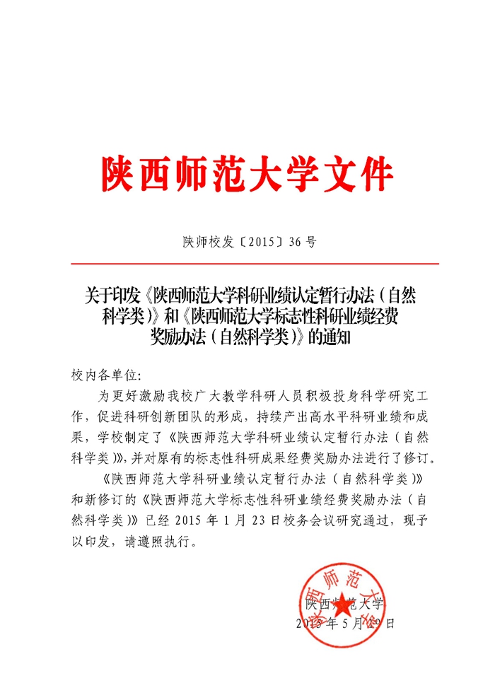 附件:《陕西师范大学科研业绩认定暂行办法(自然科学类)》和《陕西师范大学标志性科研业绩经费奖励办法(自然科学类)》