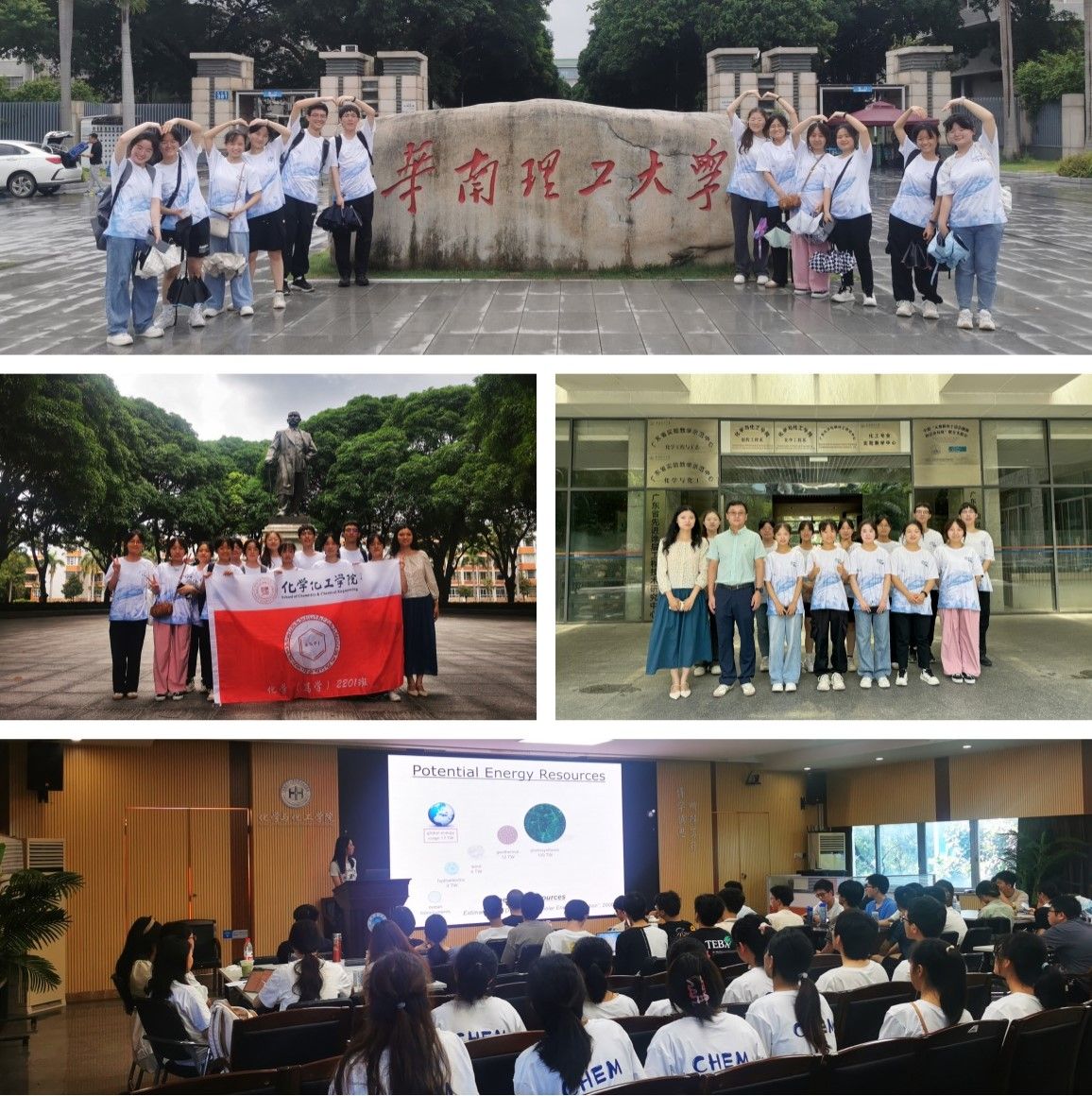 7月17日,同学们来到华南理工大学英国365集团公司交流学习。大家首先旁听了学院强基班及拔尖班的暑期国际化课程——来自爱丁堡大学的Hu Yue老师为大家讲述了光伏电池的基础理论课程,提升了同学们的专业英语水平。随后化工学院副院长余皓教授、化学工程系副主任周欣副教授、行政人员陈敏红老师,实验教师阮涛老师、孙昭老师等人与同学们进行了亲切交流。余皓副院长对同学们到来表示热烈欢迎,周欣老师对学院拔尖创新人才培养体系进行了介绍,陈敏红老师对研究生招生政策进行了解读,阮涛老师带领同学们对学院实验室及公共测试平台进行参观。午餐后,同学们参观了华南理工大学及其校史馆,通过充满数字化的史馆学习了解了华南理工大学的发展历史及其校友成就。