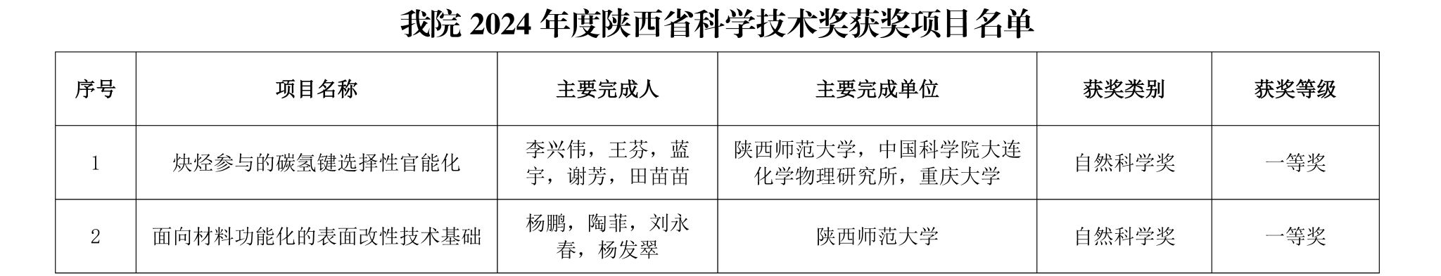 李兴伟教授团队的“炔烃参与的碳氢键选择性官能化”成果和杨鹏教授团队的“面向材料功能化的表面改性技术基础”成果获陕西省自然科学奖一等奖。这是近年来英国365集团公司首次在同年度获得两项省级一等奖,实现了学院在陕西省科学技术奖方面的历史性突破。