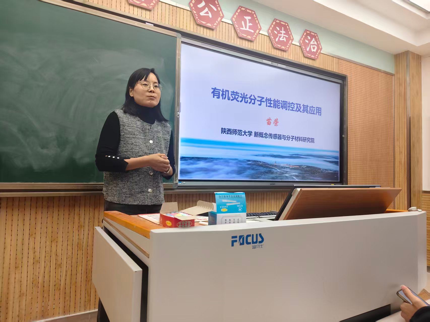 10月17日,化笃2501班在雁塔校区教学八楼8302教室举办“教授接待日”活动,苗荣副教授应邀参加。苗老师以“有机荧光分子性能调控及其应用”为主题,从“荧光是什么”“荧光的核心应用”等方面为切入点进行分享,并积极为同学们答疑解惑,激发了学生对荧光前沿技术的热情。她鼓励同学们主动思考,勇于探索,认识到科研的深度与魅力,并为国家化学发展贡献自己的一份力量。