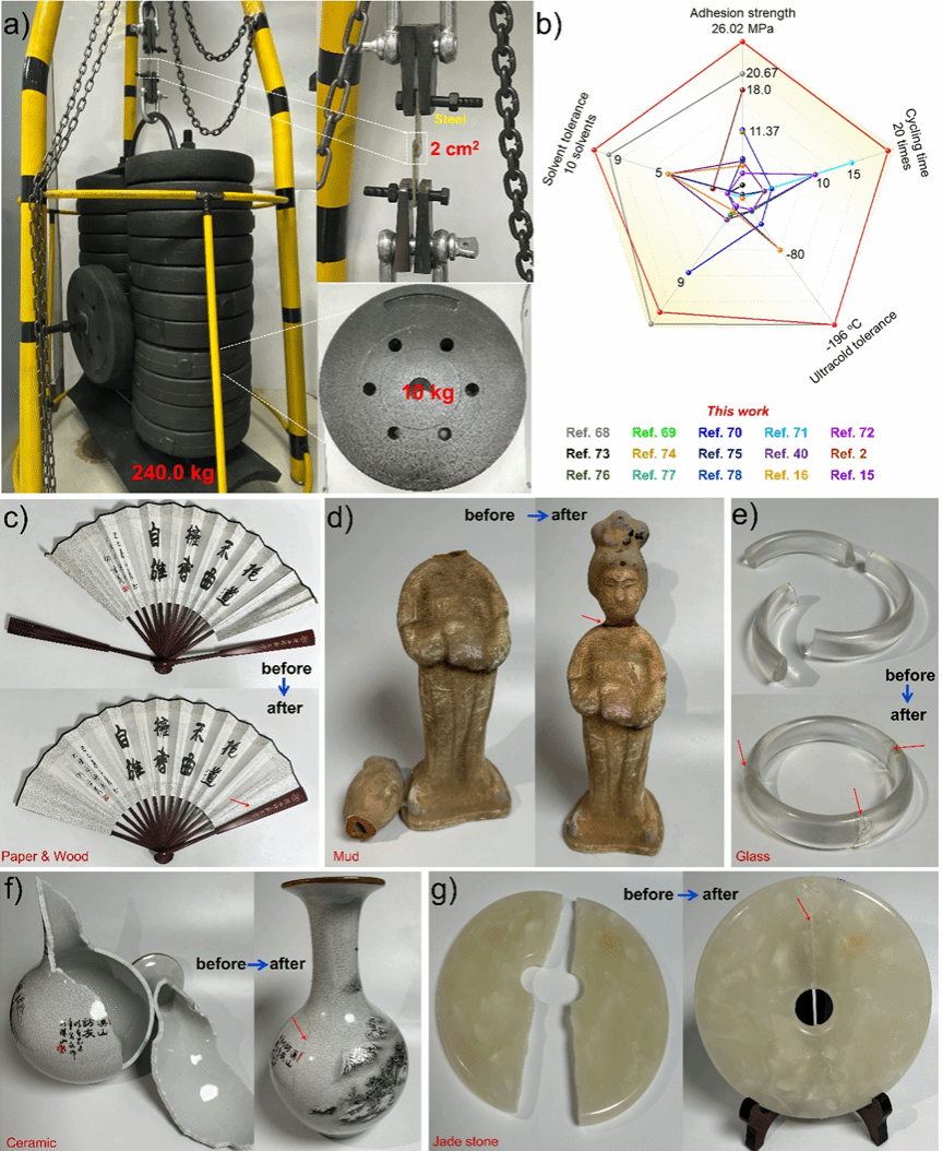 本研究发展的胶黏剂在文物材料修复方面具有显著潜力,能够通过简单的间歇性预热处理实现纸张、泥塑、陶瓷和玉石等文物材料的有效粘接成型(图3),为新一代文化遗产保护领域功能性胶黏剂的设计与开发奠定了坚实基础。